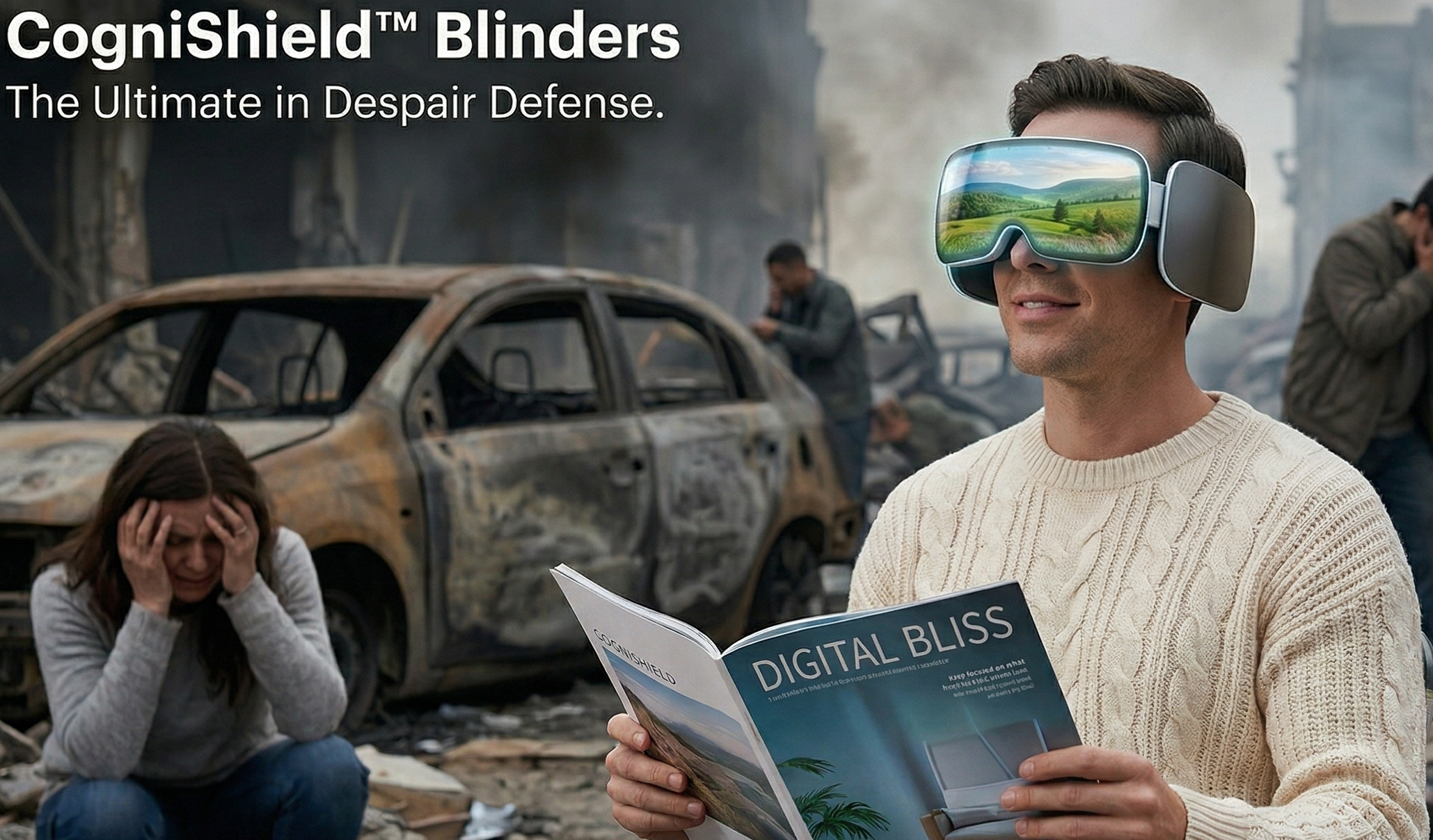 Now in limited release in select markets, including Biloxi, Mississippi; Omaha, Nebraska; and Menlo Park, CA, the new CogniShield Blinders are perceptual optimization visors designed to improve the user experience in high-noise environments. This visor uses proprietary Selective Attentional Routing (SAR™) technology to algorithmically suppress incoming stimuli categorized as "low-yield" (geopolitical instability, income disparity, images of actual suffering) and amplify "high-yield" inputs (LinkedIn endorsements, fantasy sports updates, trending social content, etc.).