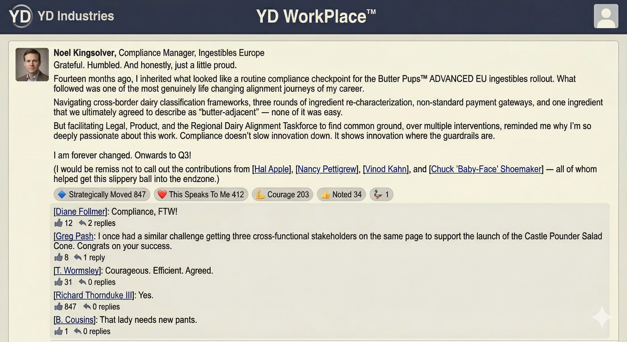 Top-performing post on the YD WorkPlace™ feed from Noel Kingsolver, Compliance Manager, Ingestibles Europe: