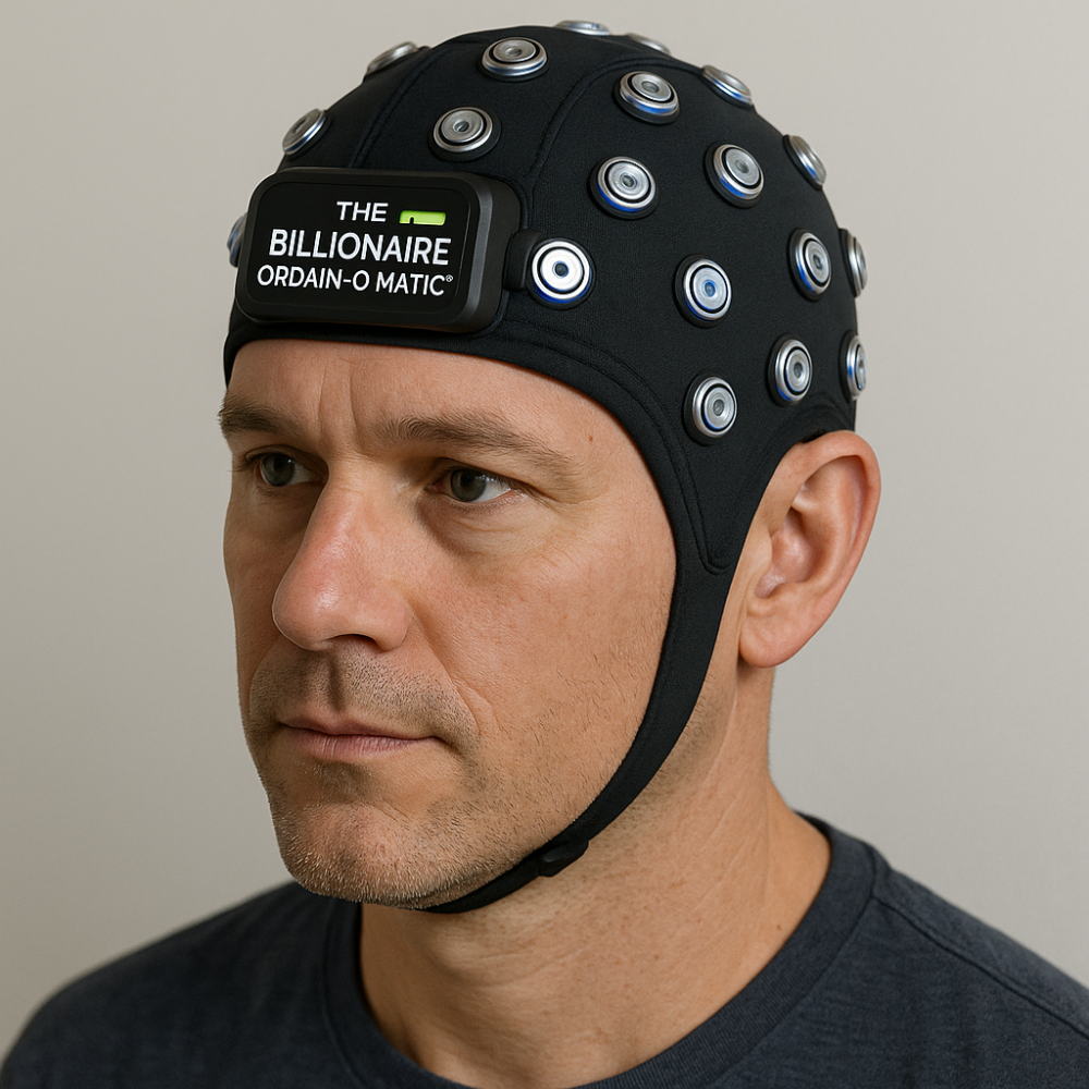 The Ordain-o-Matic™ is a sleek, form-fitting neural crown that performs a real-time scan of a user’s cognitive and genetic markers to arrive at a single proprietary metric, determining whether they possess the rare, preordained traits of a future billionaire. These include: