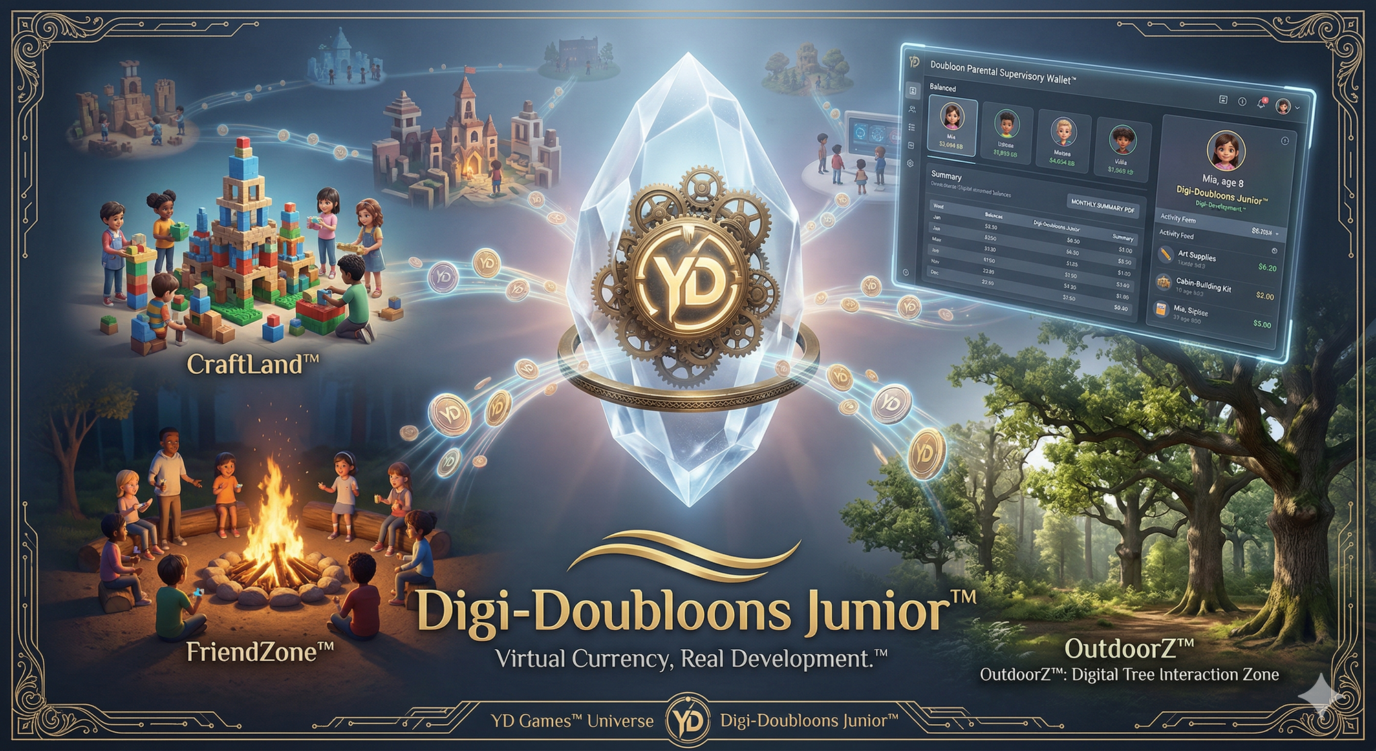 The YD Games™ Universe offers children a rich and rewarding environment spanning over 340 themed worlds, including CraftLand™, FriendZone™, and the newly launched OutdoorZ™ (a photorealistic simulation of being near trees). Children earn Digi-Doubloons Junior™ through gameplay, platform engagement, and consistent login streaks, which they may redeem in the YD Junior Marketplace™ for: digital art supplies, digital cardboard-building kits, and digital birthday party packages with donkey rides for up to nine virtual friends.