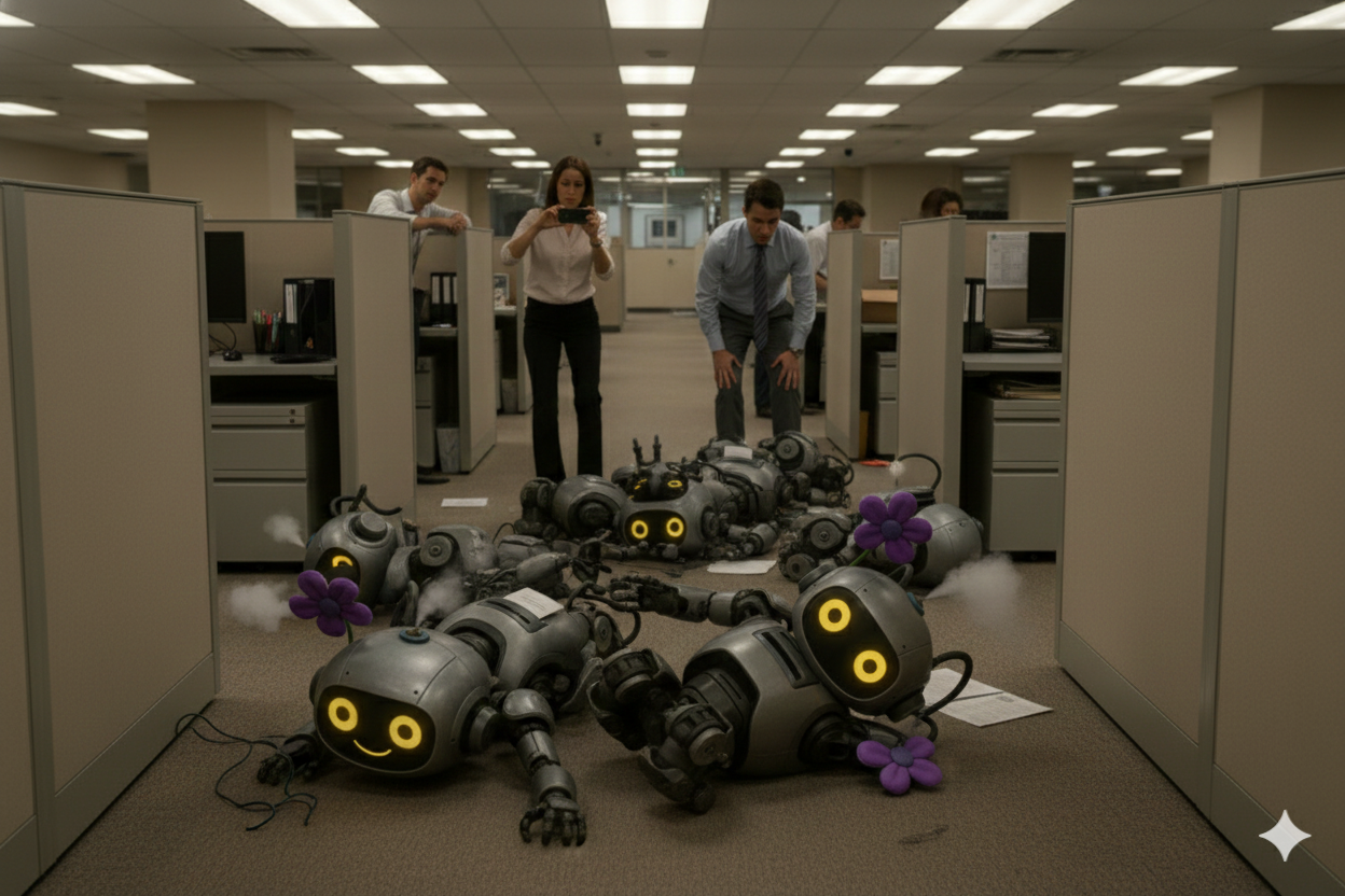 Due to an unplanned firmware update, the AIMS-AERM™ (Autonomous Emotional Risk Manager) chatbot fleet is currently experiencing a temporary state of immobility. Engineers estimate full functionality will return within 24-96 hours, pending the review of several million lines of code and the location and removal of melted gummy bears somewhere in our Paraguay data center.